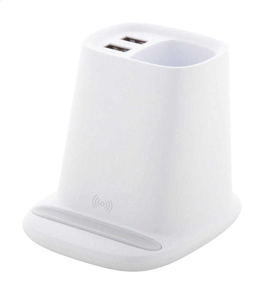 Multifunktionaler Tisch-Stifteköcher aus Kunststoff mit Handyhalter, eingebautem Wireless-Fast-Charger (10W) und zwei USB-Ladeports (max. Ausgang 2000 mA). Inkl. USB-Ladekabel.