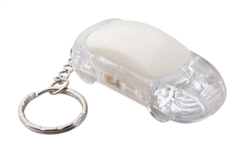 Schlüsselanhänger aus Kunststoff in Autoform mit weißem LED-Licht und Metall-Schlüsselring. Inkl. Knopfzellenbatterie.