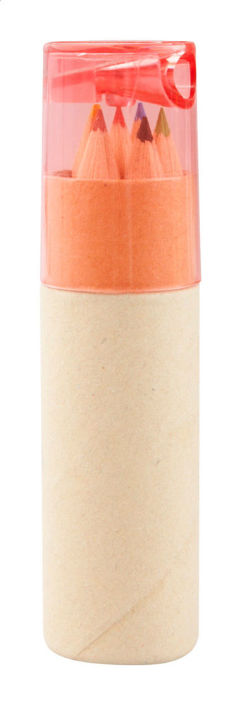 6 Buntstifte mit Anspitzer in rundem Papp-Etui.