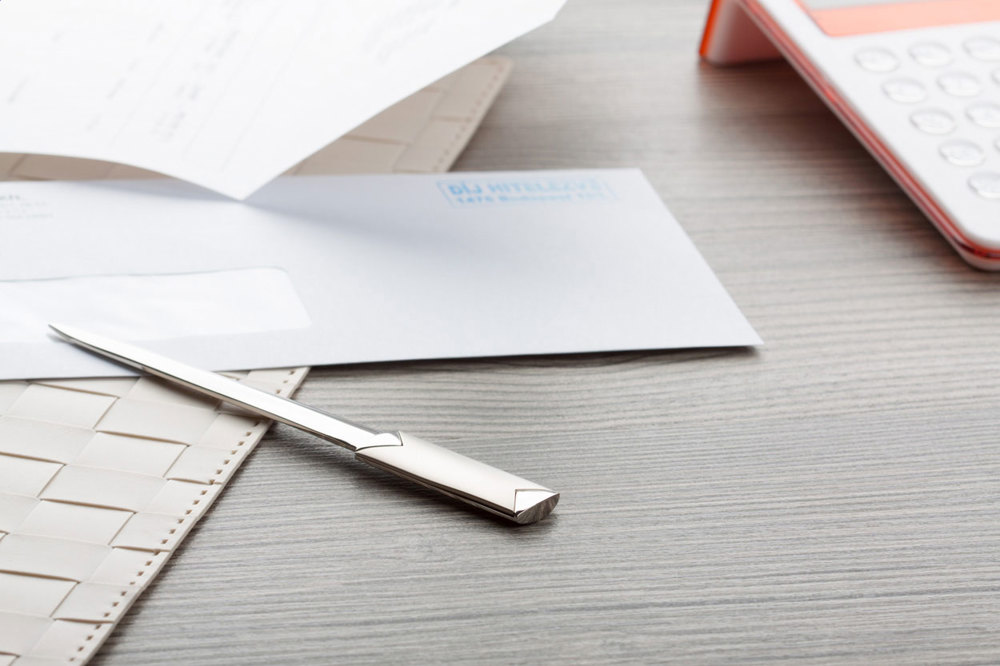 Verchromter Brieföffner aus Metall in einer schwarzen Geschenkbox. mehr