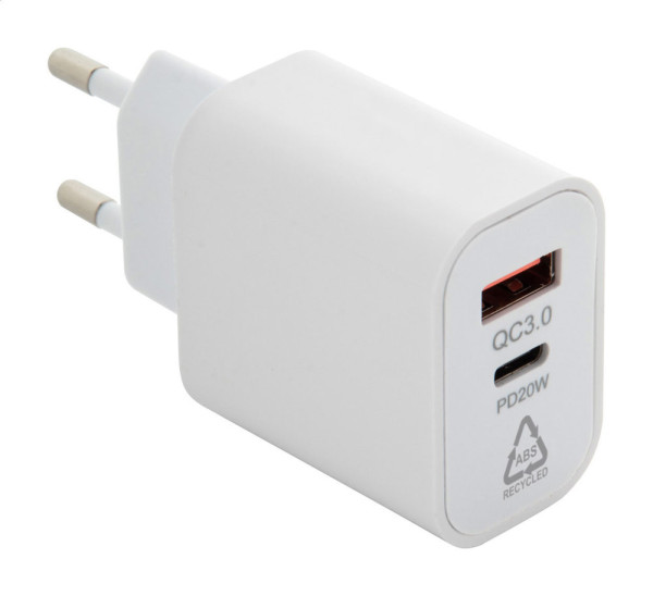 Schnelllade-USB-Netzstecker aus recyceltem ABS mit 1 USB- und 1 USB-C-Anschluss. Unterstützt Schnellladetechnologie (PD20W / QC3.0). Mit 2-poligem Europastecker.