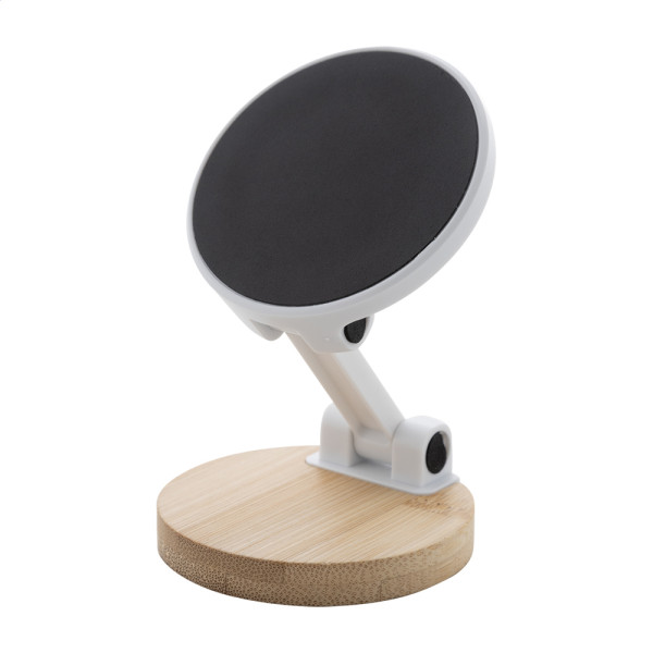 Magnetischer Handyhalter für den Schreibtisch aus Bambus und recyceltem ABS. Inklusive selbstklebendem Metallring, um die Magnetfunktion mit jedem Gerät zu nutzen. Kompatibel mit iPhone® 12 oder neuer.