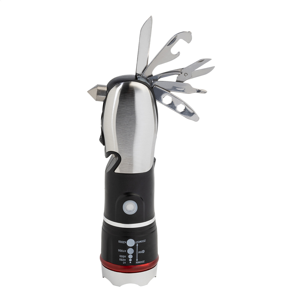 Multifunktions-Taschenlampe aus ABS und Edelstahl mit Nothammer, Gurtschneider und Multitool mit 9 Funktionen. Mit zoombarem LED-Licht und 3 Lichtmodi. Exkl. Batterien (3x AAA).