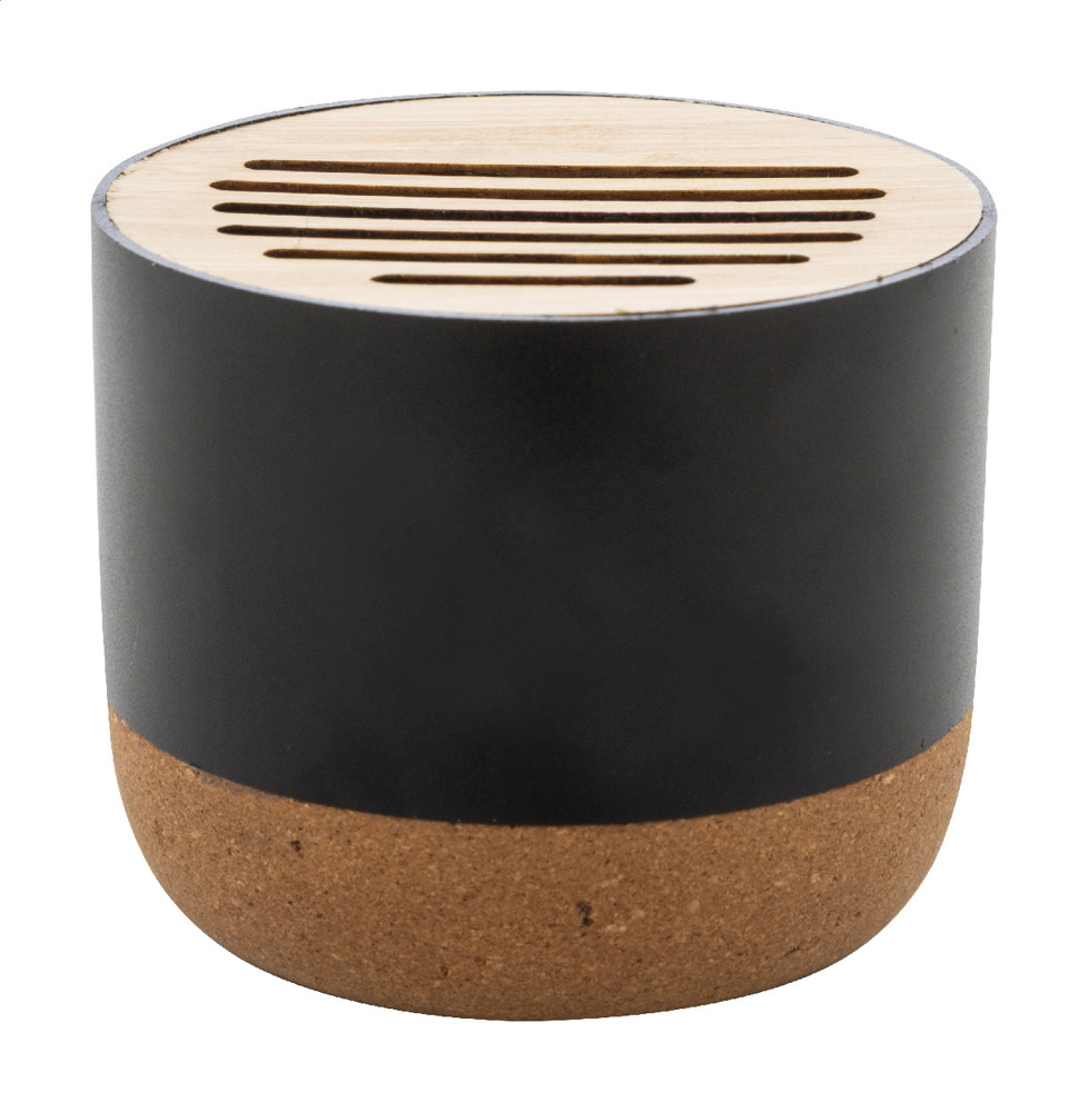 Kabelloser Lautsprecher, Gehäuse aus recyceltem Aluminium mit Bambusgitter und Sockel aus Naturkork. Mit wiederaufladbarem Akku (400 mAh). Inklusive USB-Ladekabel.