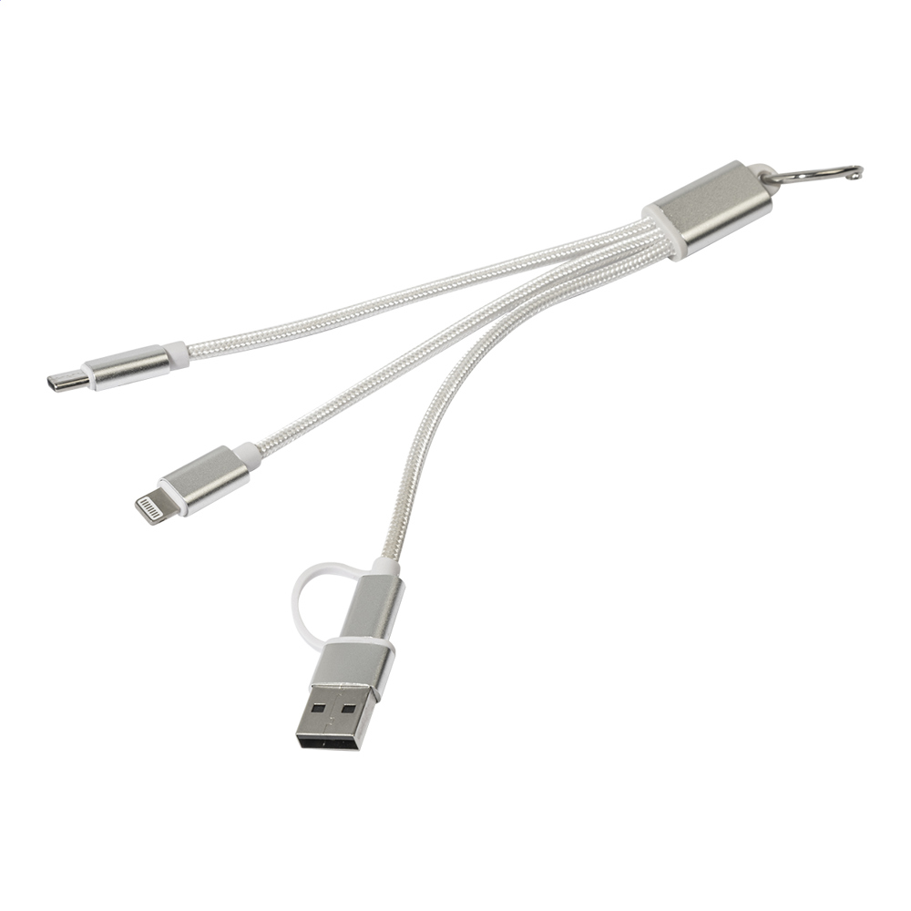 USB-Ladekabel aus recyceltem Aluminium und RPET mit Schlüsselanhänger. Mit USB, USB-C und Lightning Steckern sowie USB und USB-C Adapterstecker.