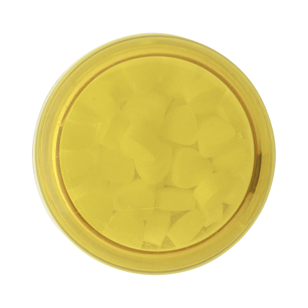 Rundes, transparentes Kunststoff-Minzglas mit farbigem Schraubdeckel. Enthält ca. 12 Gramm zuckerfreie Menthol-Bonbons.