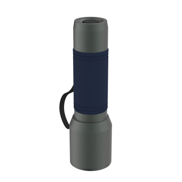 Die wiederaufladbare Taschenlampe REEVES-myFlash 300 ist eine kleinere Variante der leistungsstarken REEVES-myFlash 700. Die Taschenlampe aus recyceltem Aluminium ist ein REFLECTS®-Eigendesign für die Marke REEVES®. Die Taschenlampe ist dunkelgrau eloxiert und kann mit einem Griff-Sleeve kombiniert werden. Die Silikon-Komponenten sind in vielen verschiedenen Farben ab Köln verfügbar. Erstmals kann ein Bambus-Sleeve gewählt werden. Selbstverständlich ist die Taschenlampe auch ohne Griffmanschette erhältlich. Eine textile Griffschlaufe ist inkludiert.