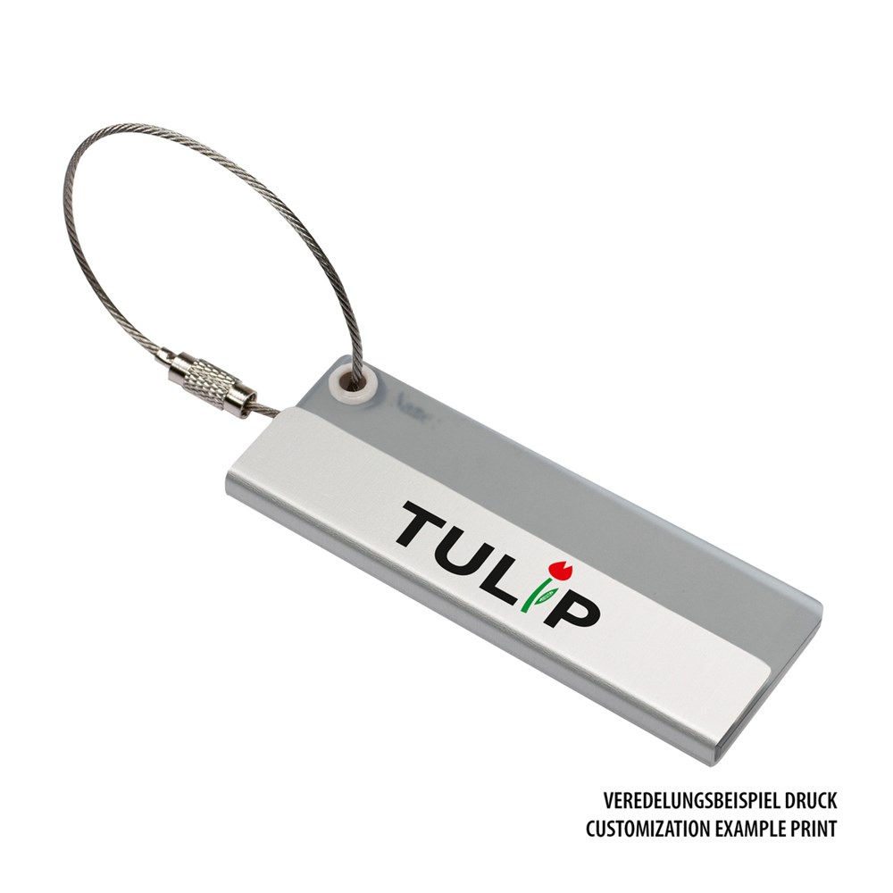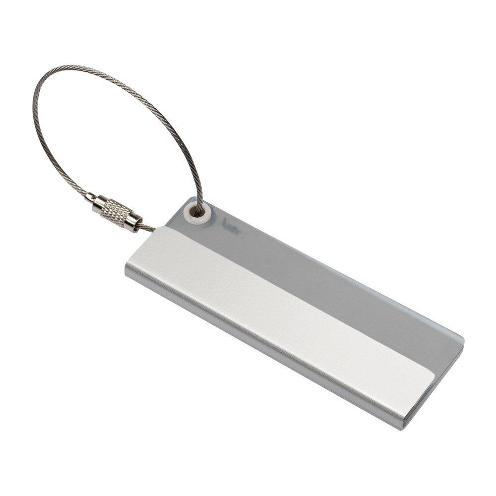 Unverfälschter Charme: Der Kofferanhänger aus silbernem Metall und hellgrauem Acryl ist ein schicker Reisebegleiter. Der Adressanhänger mit mattsilbernem Kabel und Gravurplatte ist perfekt für alle die es unauffällig, aber stilvoll mögen. Veredelbar mit einer schlichten Lasergravur oder einem bis zu zweifarbigen Tampondruck.
