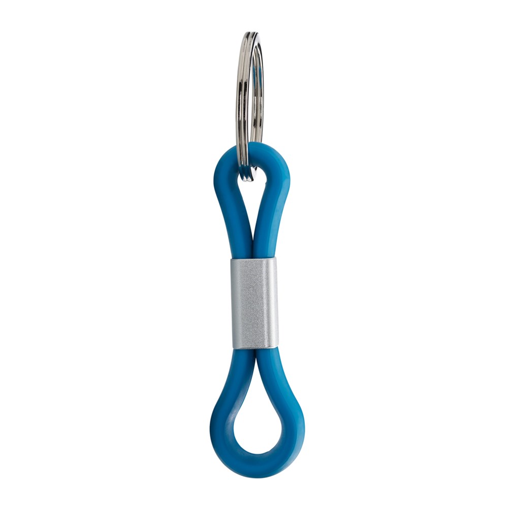 Ein Hingucker am Schlüsselbund mit angenehmer Haptik. Die Silikonschlaufe in Cyan hat eine silberne Spange aus Metall. Auf dieser können Sie Ihr Logo perfekt mit einer edlen Lasergravur in Szene setzen.
