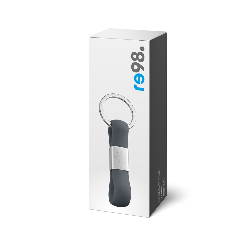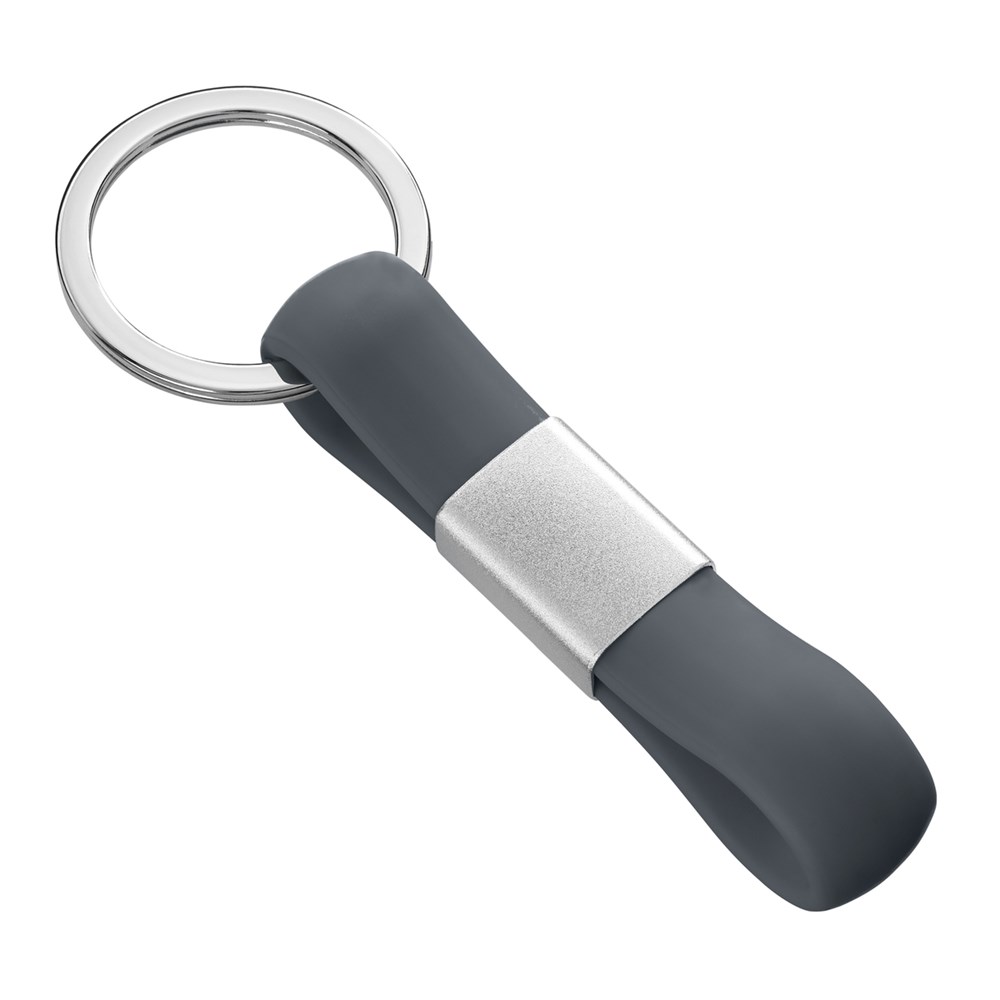 Ein Hingucker am Schlüsselbund mit angenehmer Haptik. Die Silikonschlaufe in Grau hat eine silberne Spange aus Metall. Auf dieser können Sie Ihr Logo perfekt mit einer edlen Lasergravur in Szene setzen.