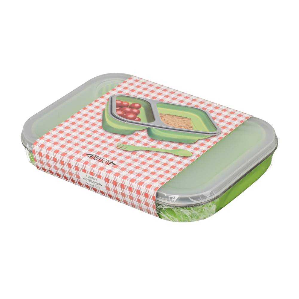 Abwechslungsreiche Pausensnacks haben in diesem faltbaren Doppelfachbehälter aus Silikon genügend Platz. Inklusive Löffel und Gabel in Besteckhalterung. Mikrowellengeeignet.