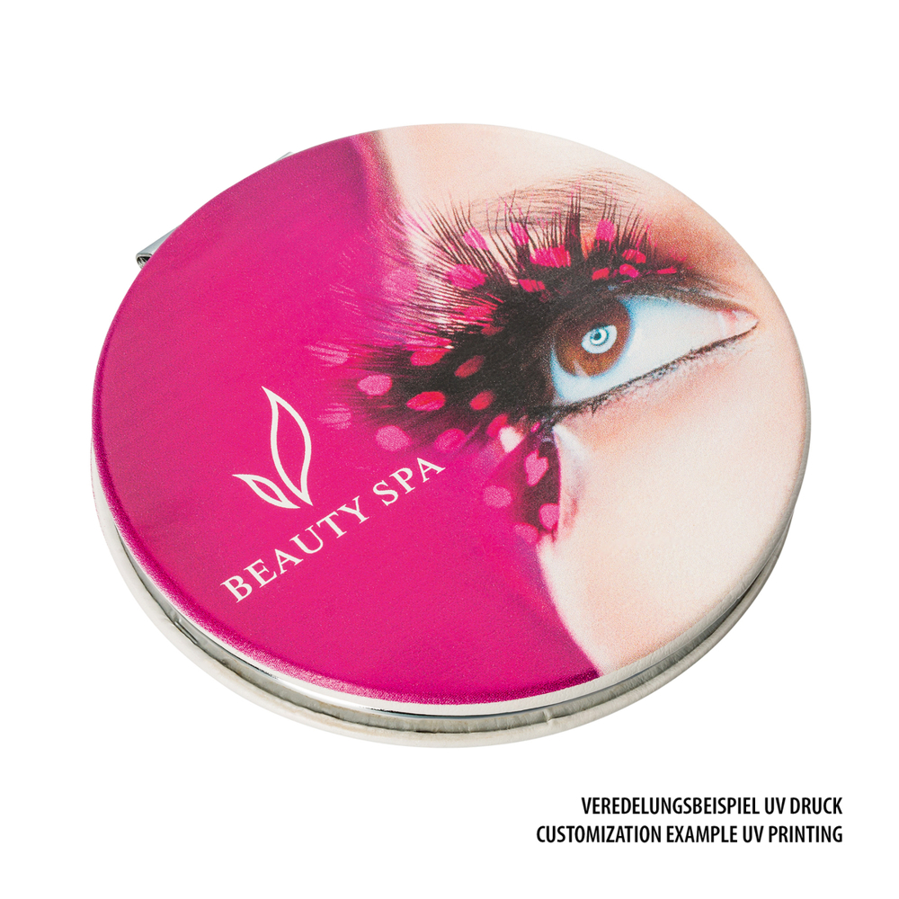 Machen Sie aus diesem Doppel-Kosmetikspiegel (Vergrößerung 2fach) Ihr Unikat. Die Kunstleder-Oberfläche ist per REFLECTS-UV-Print mit Ihrem fotorealistischen Motiv wirkungsvoll und unnachahmlich veredelbar.
