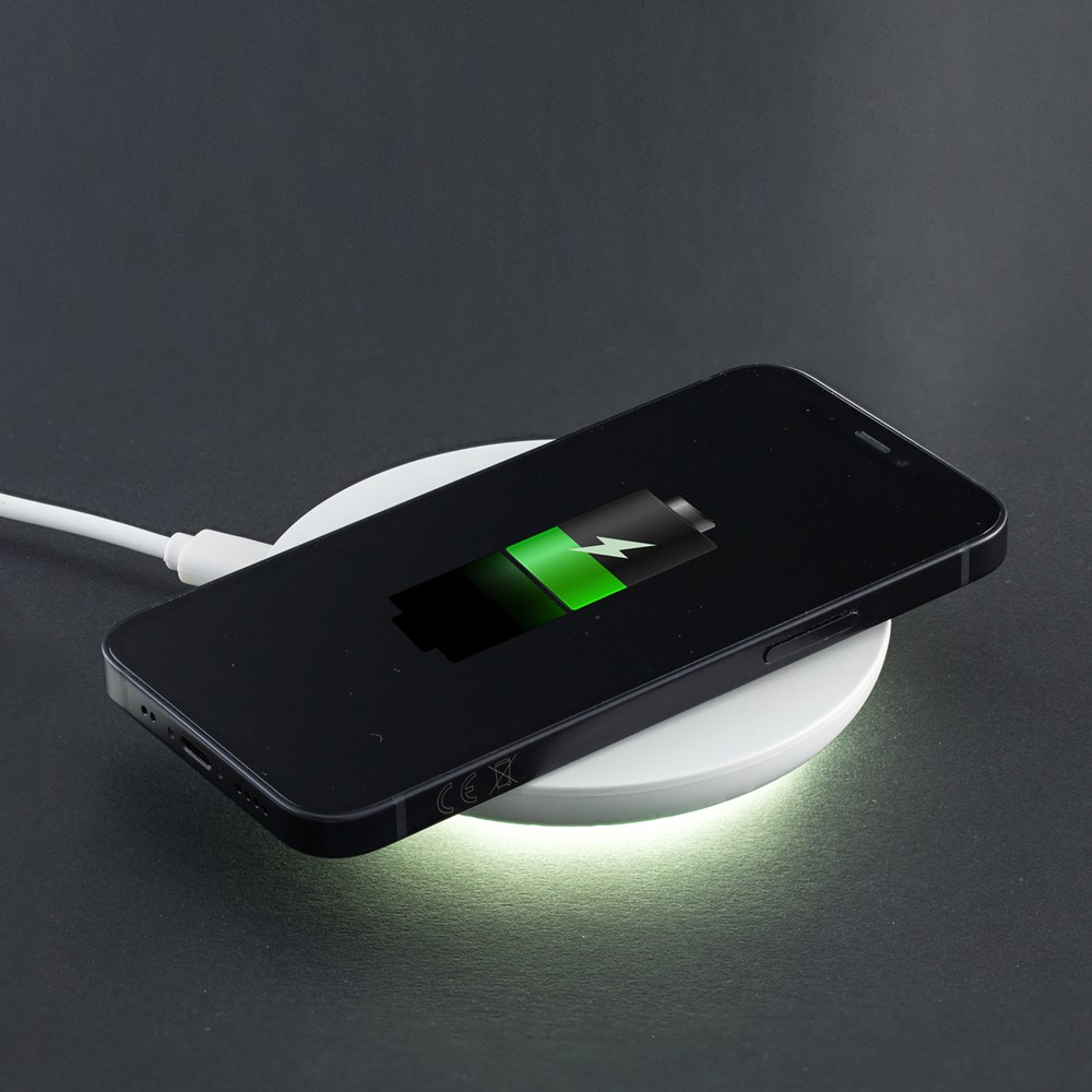 Der Wireless Charger hat eine Ausgangsleistung bis zu 15 Watt (Fast Charge), je nach Kompatibilität des zu ladenden Endgerätes. Ist das Gerät an eine Stromquelle angeschlossen, leuchtet ein weißer Lichtring auf der Unterseite des Chargers. Der Charger ist so designed, dass das Licht den Eindruck eines über ihm schwebenden Gerätes erweckt. Während des Ladevorgangs pulsiert der Lichtring weiß.