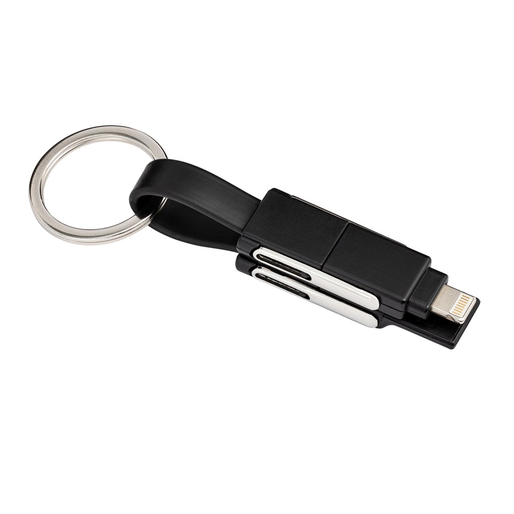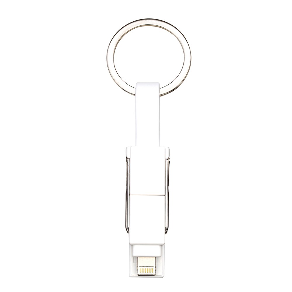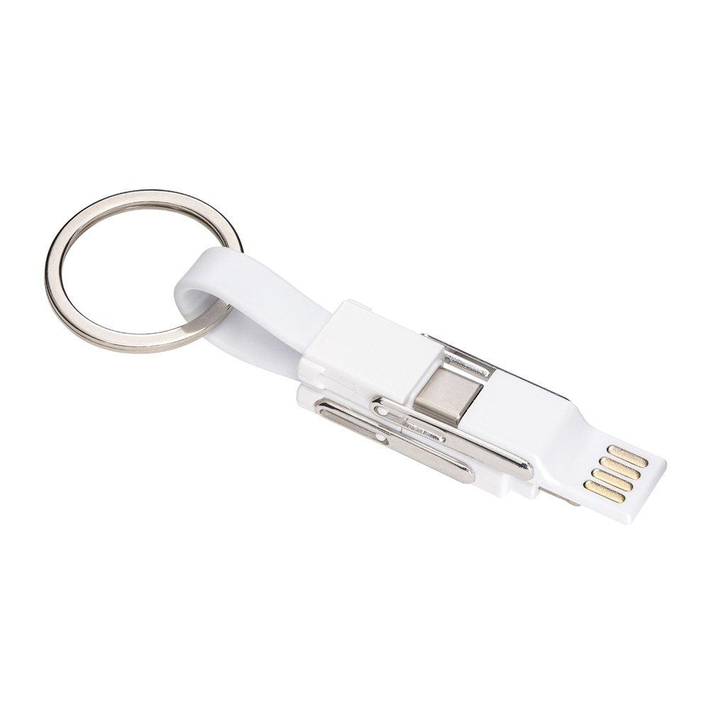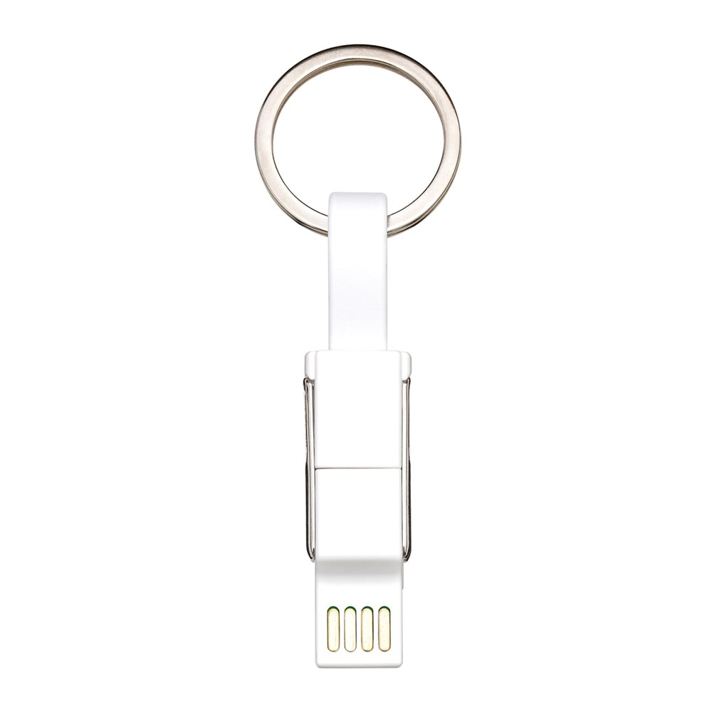 Das 6-in-1 Ladekabel REEVES-MIXCO III ist ein idealer Gefährte für unterwegs, das in Schwarz oder Weiß erhältlich ist. Es vereint mehrere Anschlüsse, die eine hohe Flexibilität beim Aufladen sowie Datentransfer ermöglichen. Auf der einen Seite des Kabels sind ein USB-A- und ein USB-C-Anschluss zu finden; auf der anderen Seite ein USB-C-Anschluss, ein Micro-USB- sowie ein 8-Pin-Adapter für Apple®. Mithilfe des integrierten Magnetverschlusses lassen sich die beiden Seiten leicht miteinander verbinden. Die Länge des flexiblen USB-C auf USB-C-Kabels beträgt 14 cm, was beim Aufladen unterwegs mit Powerbank sehr praktisch ist. Dank des abnehmbaren Schlüsselrings kann das Multikabel bequem am Schlüsselbund befestigt werden und ist dadurch immer griffbereit.