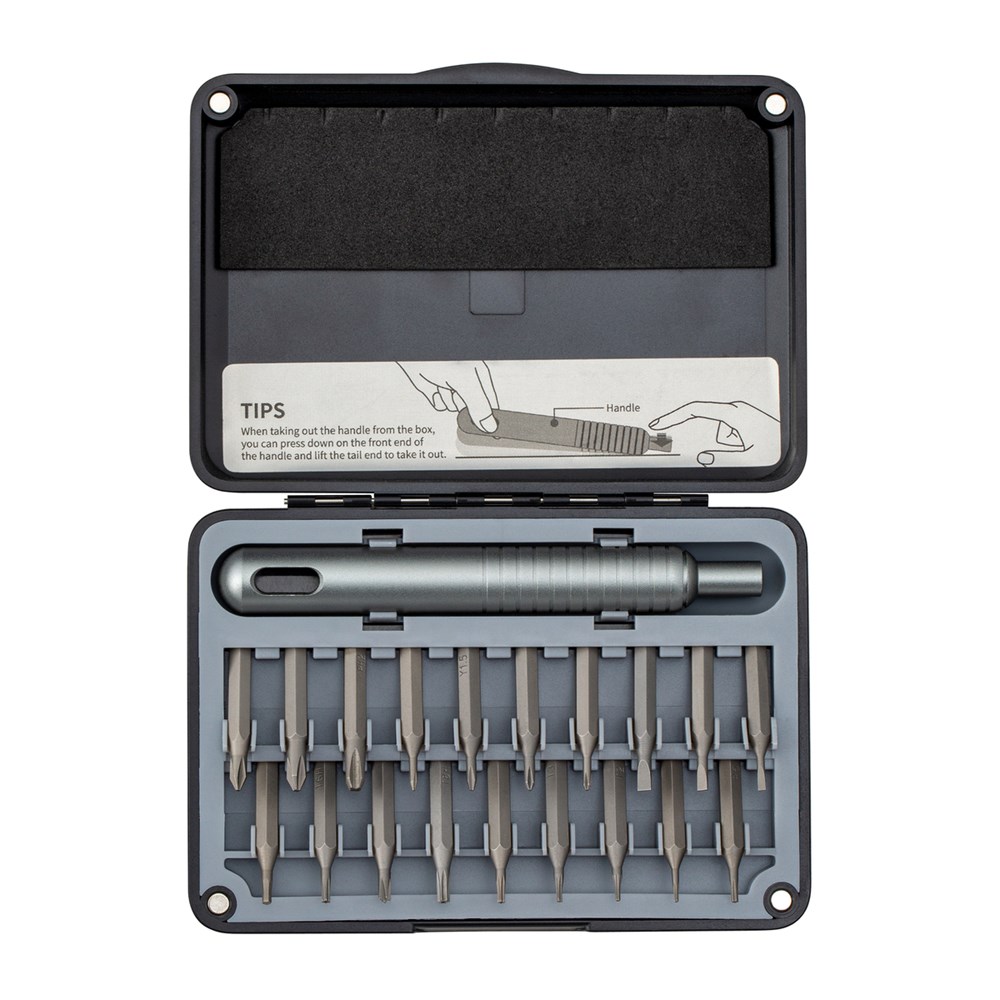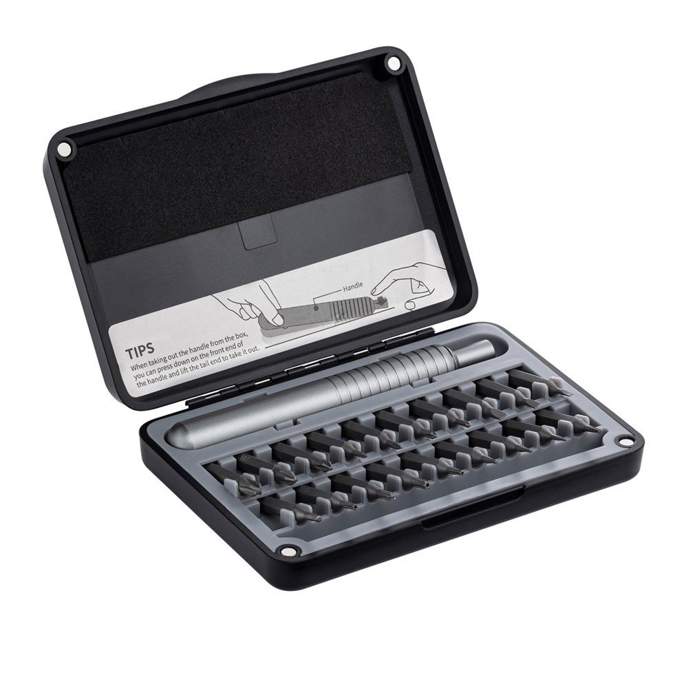 Präzise Arbeit erfordert präzise Werkzeuge. Dieses hochwertige Werkzeug-Set für Feinmechanik präsentiert sich in einer stilvollen, schwarzen Box und wurde speziell für filigrane Arbeiten an Laptops, Computern, Brillen und ähnliches konzipiert. Der matte Schraubendreher mit Bithalter und die 19 magnetischen Bits aus besonders hartem S2-Edelstahl - darunter 9 Sternschrauben Bits, 2 Schlitzschrauben Bits und 8 Kreuzschrauben-Bits - sorgen für maximale Anpassungsfähigkeit und Präzision. Die Box aus recyceltem ABS-Kunststoff zeigt sich nicht nur elegant, sondern bewahrt mit ihrem hochwertigen Magnetverschluss den Inhalt sicher auf. Das Innere aus recyceltem Polypropylen schützt und organisiert die Werkzeuge optimal.