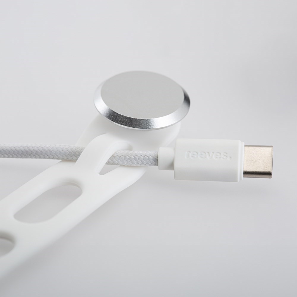 REEVES-Convertics Tie ist eine exklusive Eigenentwicklung von REFLECTS®, welche kreatives Design und herausragende Funktionalität vereint. Der Kabelbinder aus Silikon ist in sechs Farbvarianten erhältlich, von lebendigem Rot und Orange bis zu zeitlosem Schwarz und Weiß. Mit dem Kabelbinder lässt sich das mitgelieferte USB-C auf USB-C-Kabel bequem zusammenbinden und mitnehmen. Beim Ladevorgang besteht die Möglichkeit, das 1 m lange Ladekabel in den dafür vorgesehenen Schlitzen des Kabelhalters zu fixieren. Auf diese Weise vermeiden Sie ein mögliches Verlieren des Halters.