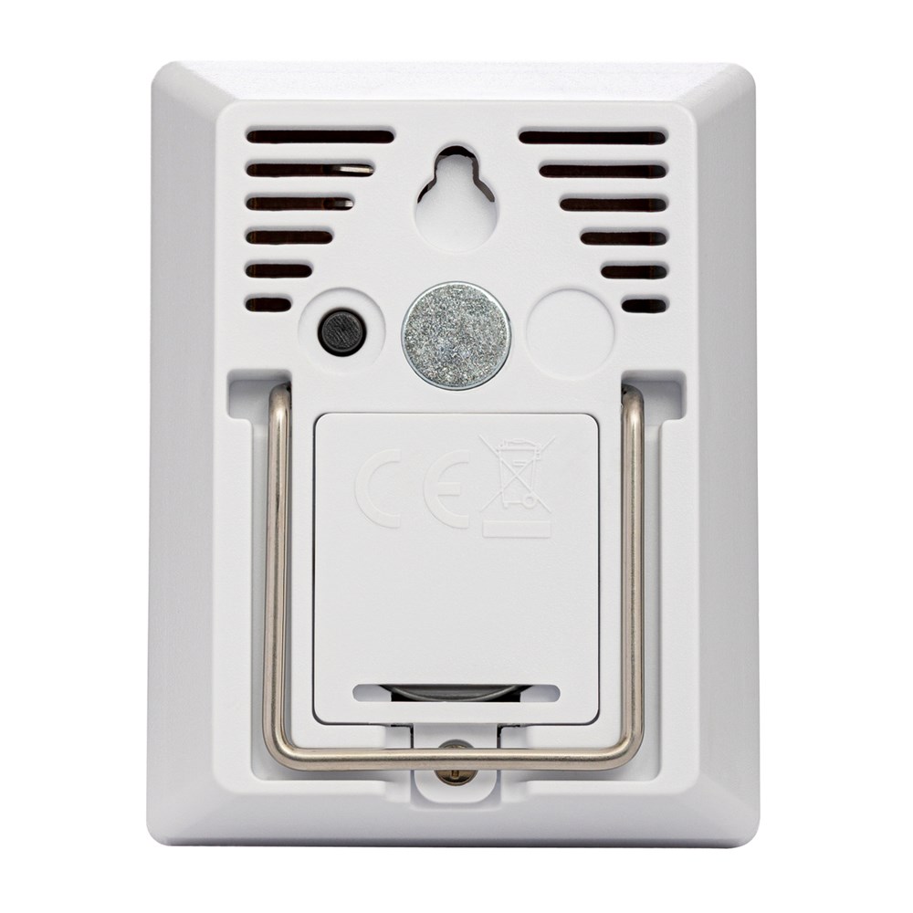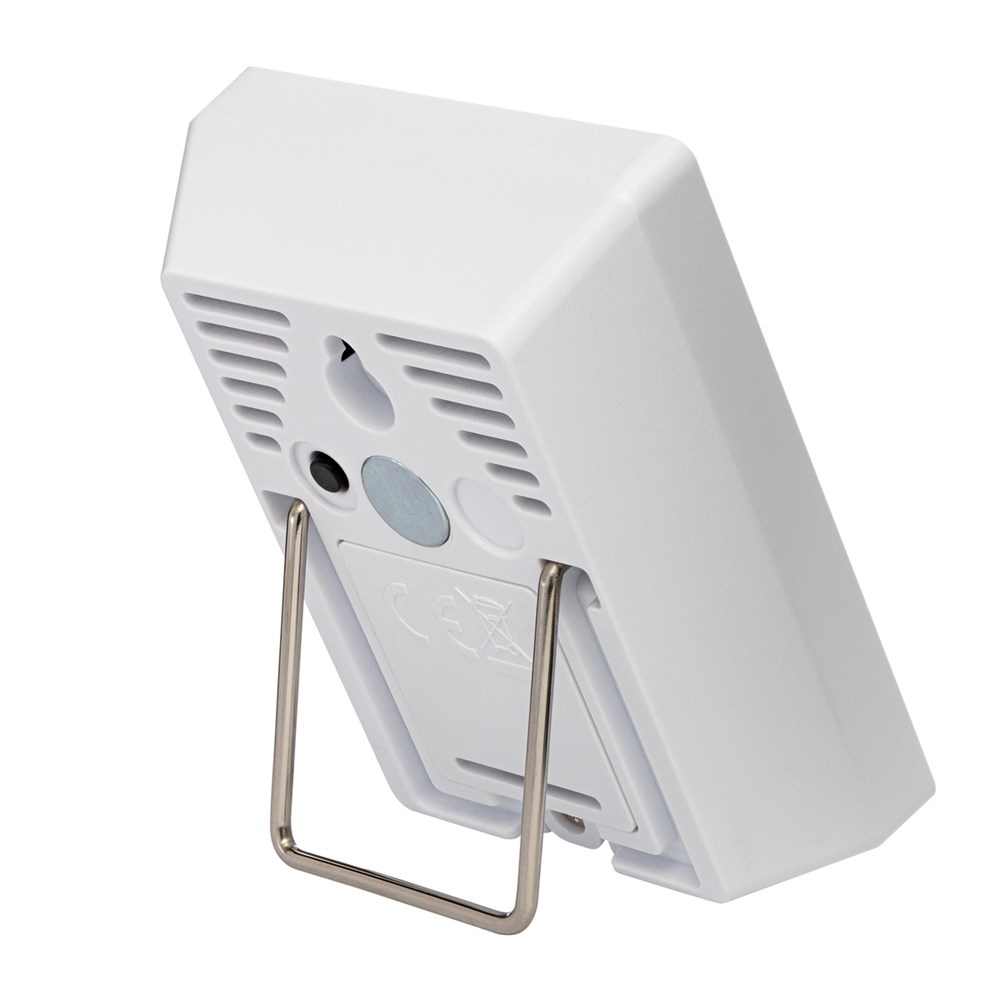 Die batterie-betriebene Wetterstation dient gleichzeitig als Thermometer und Hygrometer für Innenräume. Das Thermometer bietet einen Messbereich zwischen 0 °C und 50 °C, während das Hygrometer die Luftfeuchtigkeit zwischen 20%-95% RH misst (RH: relative Luftfeuchte, eng. „relative humidity“).