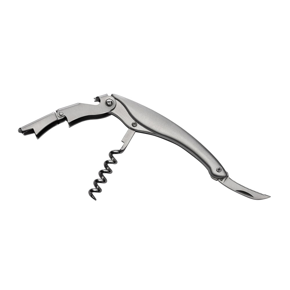 Das Kellnermesser RE98-Silverserve ist äußerst praktisch und bequem zu handhaben. Der Weinflaschenöffner aus Aluminium passt perfekt in die Hand und hat ein angenehm leichtes Gewicht. Drei Werkzeuge stehen zur Verfügung: ein Korkenzieher, ein Flaschenöffner sowie ein Folienschneider mit robustem Sägeschliff.