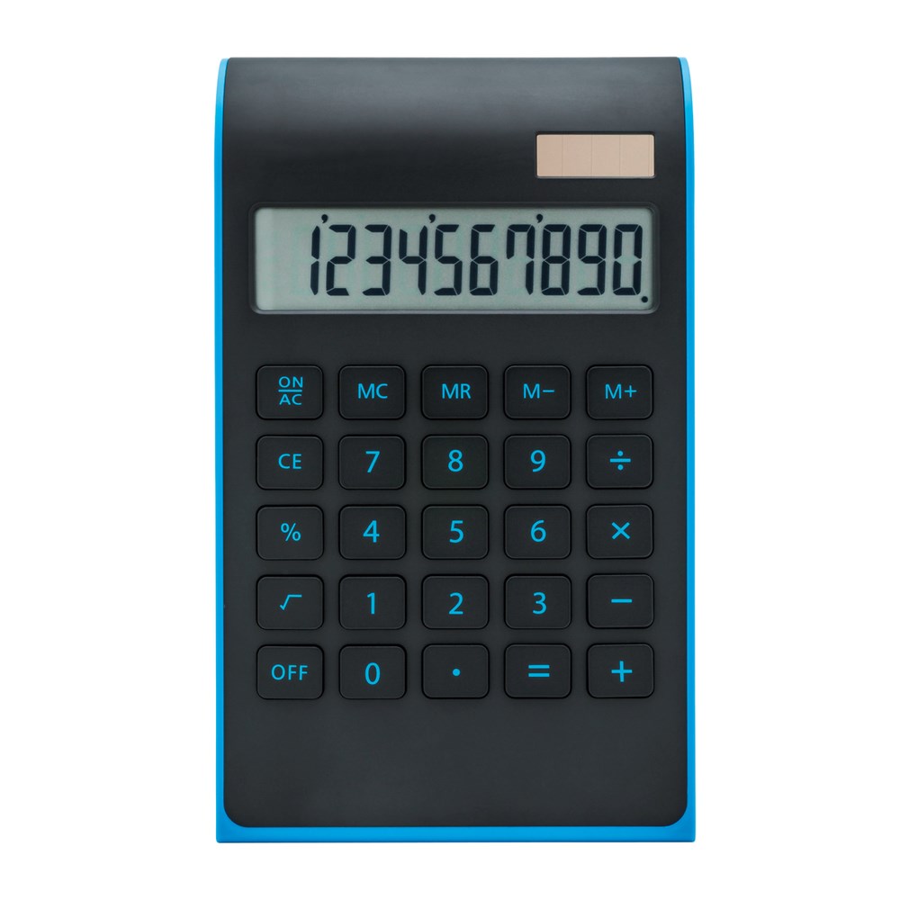 Geschwungener und formschöner Tischrechner mit Dualpower (Solar und Batterie). Die Seiten des Taschenrechners sind farblich abgesetzt und bilden einen angenehmen Kontrast zur schlichten schwarzen Oberfläche. Die flachen Tasten des Solartaschenrechners sind schwarz mit blauem Aufdruck. Die gut sichtbare Veredelungsfläche kann im Tampondruck (1 bis 4c) oder im UV Druck mit Logo veredelt werden. Das Display zeigt 10 Stellen und die Batterie ist enthalten.