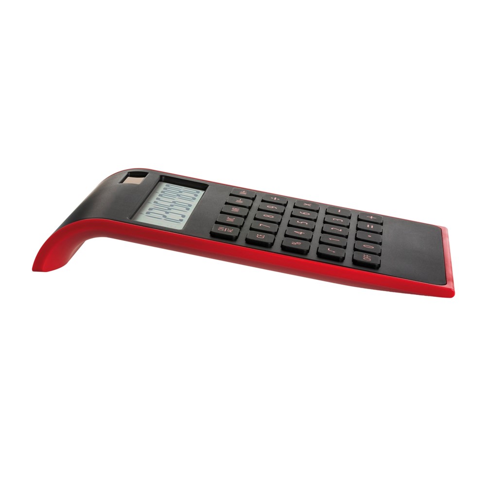 Geschwungener und formschöner Tischrechner mit Dualpower (Solar und Batterie). Die Seiten des Taschenrechners sind farblich abgesetzt und bilden einen angenehmen Kontrast zur schlichten schwarzen Oberfläche. Die flachen Tasten des Solartaschenrechners sind schwarz mit rotem Aufdruck. Die gut sichtbare Veredelungsfläche kann im Tampondruck (1 bis 4c) oder im UV Druck mit Logo veredelt werden. Das Display zeigt 10 Stellen und die Batterie ist enthalten.