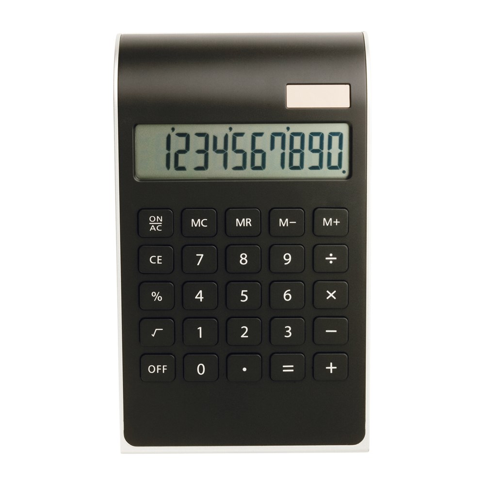 Geschwungener und formschöner Tischrechner mit Dualpower (Solar und Batterie). Die Seiten des Taschenrechners sind farblich abgesetzt und bilden einen angenehmen Kontrast zur schlichten schwarzen Oberfläche. Die flachen Tasten des Solartaschenrechners sind schwarz mit silbernem Aufdruck. Die gut sichtbare Veredelungsfläche kann im Tampondruck (1 bis 4c) oder im UV Druck mit Logo veredelt werden. Das Display zeigt 10 Stellen und die Batterie ist enthalten.
