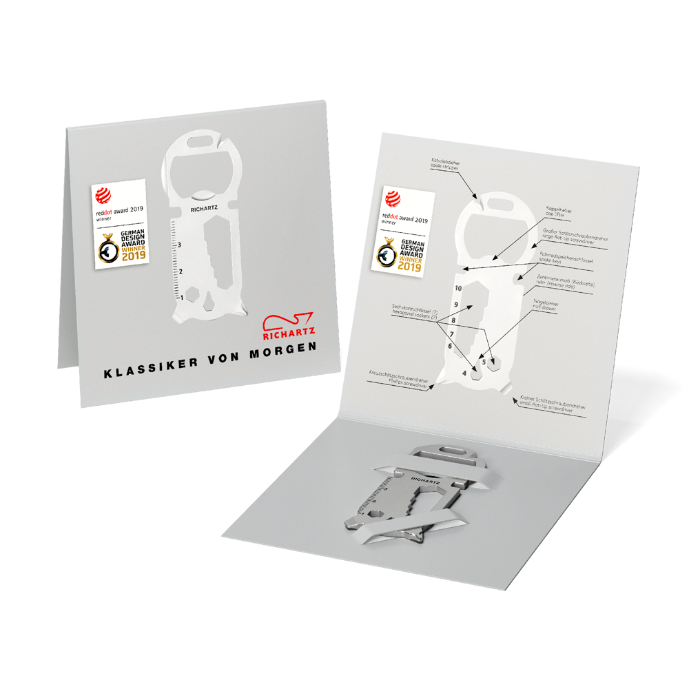 Ausgezeichnet mit dem German Design Award ist das RICHARTZ KEY TOOL® 16+ der erfolgreiche Werbeträger für Marken und Unternehmen. Mit einer individuellen Lasergravur und individuell gestalteter 4-seitigen Verpackung in 4c, werben Marken aufmerksamkeitsstark und aussagekräftig!