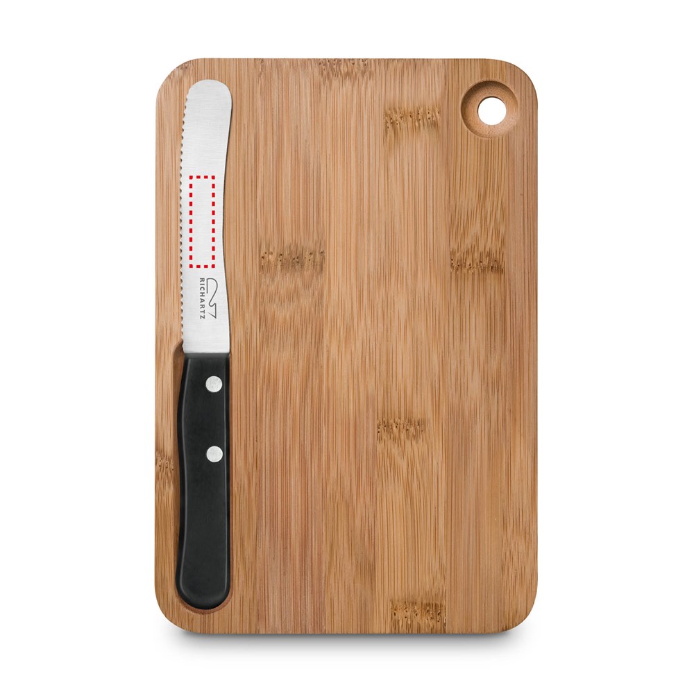 Das Messer wird magnetisch in der Griffmulde des Bambusbretts gehalten – ein echter Hingucker der durch die lange und häufige Nutzung dauerhaften Werbeerfolg garantiert.