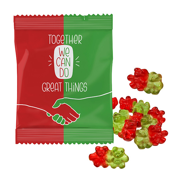 Fruchtgummi mit 10 % Fruchtgehalt aus Fruchtsaftkonzentrat, natürlichen Aromen und färbenden Lebensmittelkonzentraten, in 2 Farben und 2 Geschmäckern. Vereint zu lecker rot/grünem und Erdbeer/Rhabarber Fruchtgummi verbinden diese Freundschaftsbärchen, auch Deine Werbethemen. Verpackt in glänzend- oder matt-kaschiertem transparentem alternativ weißem Werbetütchen.