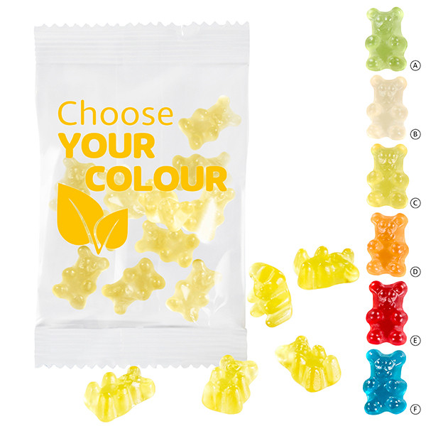 Welche Farbe passt am besten zu Deinem Werbebotschaft? Gelb, Grün, Orange, Rot, Transparent oder Blau? Du hast die Wahl - wähle aus 6 Farben und Geschmacksrichtungen Dein passendes Premium-Bärchen - sortenrein, VEGAN ohne Gelatine, mit Pektin, in transparentem alternativ weißem kompostierbarem Werbetütchen verpackt.