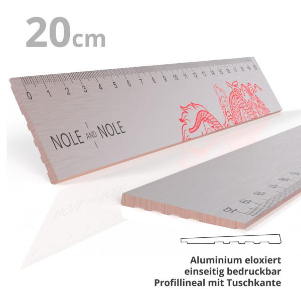 Details • Längen messen von 20 cm • Skala in Ihrer Wunschfarbe • bei Bedarf Ihre ganz individuelle Wunschskala 1:X • bedruckbar im Siebdruck • einfarbig dezent oder vollflächig effektvoll bedruckt • Material: Aluminium, silbern eloxiert • abgeschrägtes Profil, rückseitig gerillt • Tuschekante zum leichten Anheben der Zeichenkante • auf Wunsch professionell unterstützt durch unser Grafiker-Team
