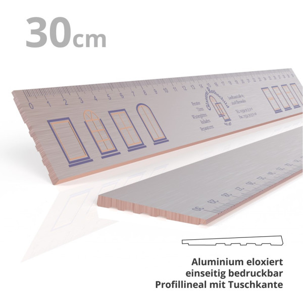 Details • Längen messen von 30 cm • Skala in Ihrer Wunschfarbe • bei Bedarf Ihre ganz individuelle Wunschskala 1:X • bedruckbar im Siebdruck • einfarbig dezent oder vollflächig effektvoll bedruckt • Material: Aluminium, silbern eloxiert • abgeschrägtes Profil, rückseitig gerillt • Tuschekante zum leichten Anheben der Zeichenkante • auf Wunsch professionell unterstützt durch unser Grafiker-Team