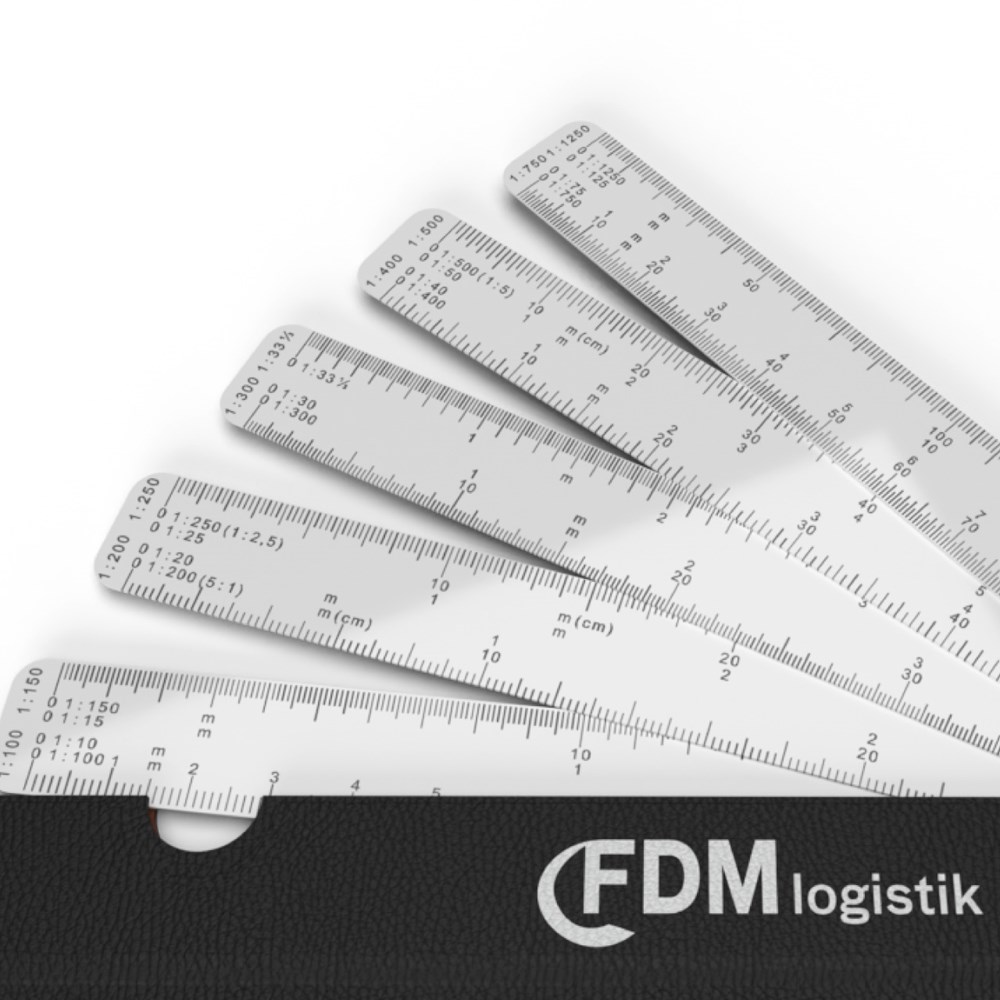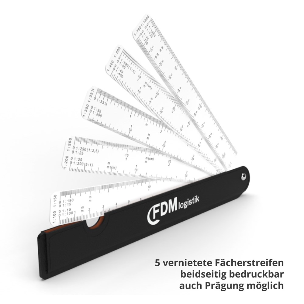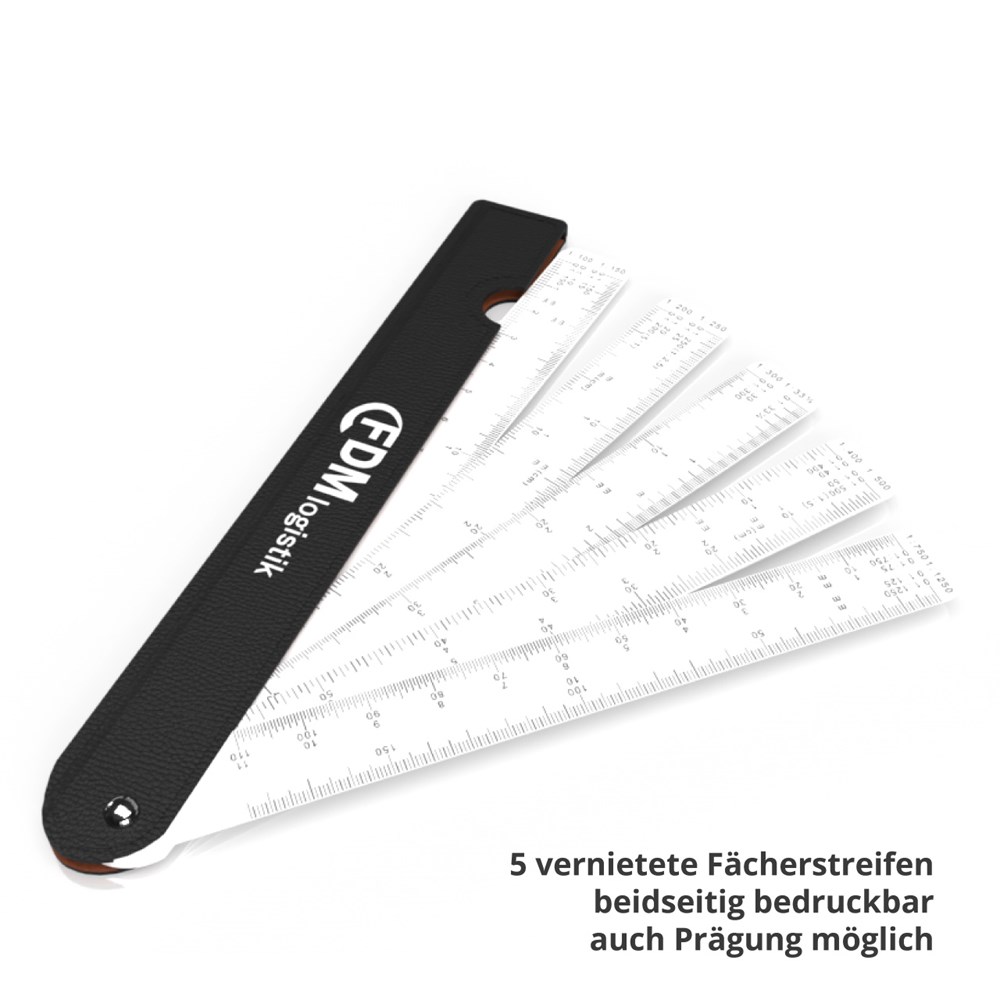 5 überzeugende Reduktionslineale mit insgesamt 19 unterschiedlichen Skalen vernietet im Etui aus Echtleder. Nach Kundenwunsch bedrucken wir individuell das Fächerreduktionslineal.