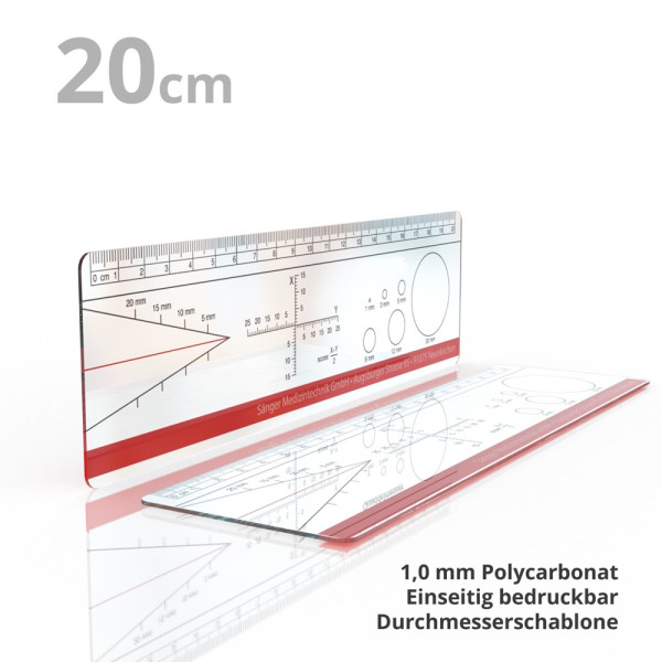 Details • Durchmesser von 1 bis 30 mm ermitteln • Skala mit 20 cm Länge • individuell einfarbig oder mehrfarbig bedruckbar • bedruckt im Siebdruck • Material: Kunststoff, transparent, flach, biegsam • Materialstärke: 1,0 mm • auf Wunsch professionell unterstützt durch unser Grafiker-Team