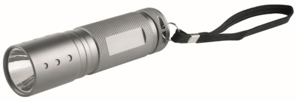 Hochleistungsstarke LED-Taschenlampe im Aluminiumkorpus, extrem sparsam und weit leuchtend. LED: 180 Lumen, Leuchtdauer: 5h, Spritzwasser- und überspannungsgeschützt, VPE 40. 3 AAA-Batterien, Metallschatulle, Designkarton.