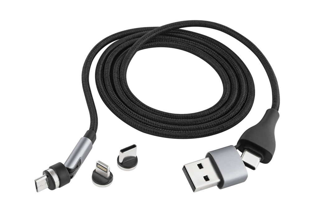 All inclusive Profi-Ladekabel aus recyceltem Material mit Datentransfer & 3A Fast-Charging. Einfachste Handhabung dank der magnetischen Ladeadapter (USB-C, Lightning®, Micro- USB) - einfach in Ihr Handy einstecken und so den Lade Port schützen und per magnetischem Klick aufladen - ideal für alle modernen Handys und Tablets. 1m Ladekabel, 3 Magnetadapter Micro-USB/USB-C/ Lightning®, 3A, Datentransfer, VPE 300, Recycling Anteil 26%, Designbox