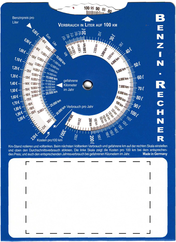 Parkscheibe "NUMBER" mit Benzinrechner, aus Karton. (Format: 110 x 150 mm) mehr