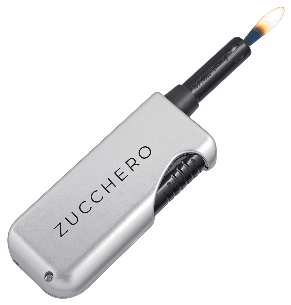 Stabfeuerzeug „FIREBOY“ Silberfarbenes Gehäuse mit großer Werbefläche. Lieferung erfolgt im Geschenkkarton. (Format: 115 x 30 mm)
