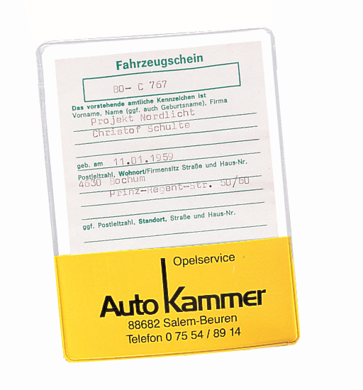 Kfz.-Scheinhülle "FERO" aus transparenter Folie mit großer Werbefläche. Das besondere Angebot zum Superpreis! (Format: 85 x 115 mm) PREIS IN GELB BITTE AUF ANFRAGE !