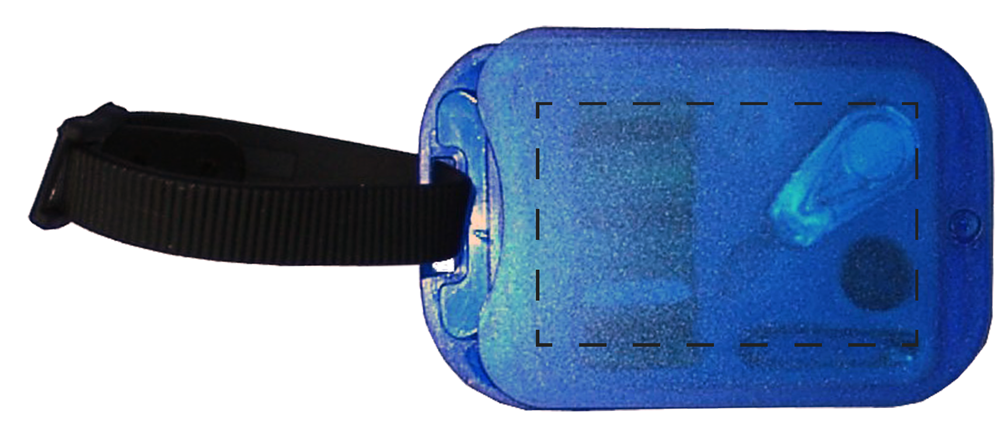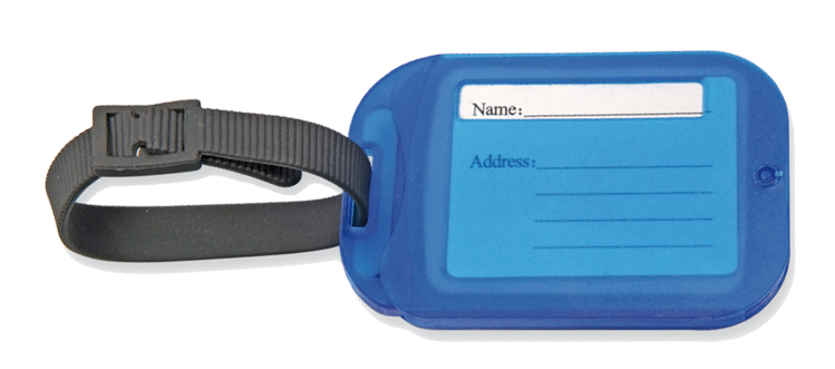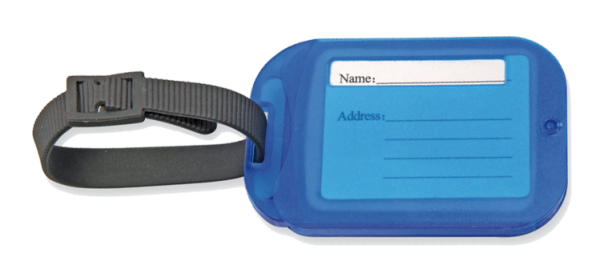 Kofferanhänger "SEAM" mit integrierten Nähutensilien. Aus gefrostetem Material. (Format: 85 x 55 mm)