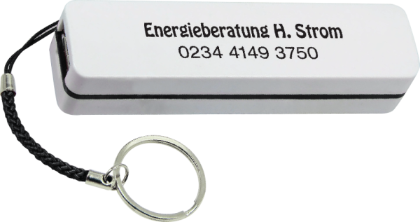Ladegerät „POWER BANK II“ Mobiles, externes Ladegerät mit zusätzlichem Schlüsselanhänger. Mit 2200 mAh zum Aufladen aller gängigen Smartphones. Lieferung erfolgt in einer Geschenkbox. (Format: 95 x 25 x 18 mm)