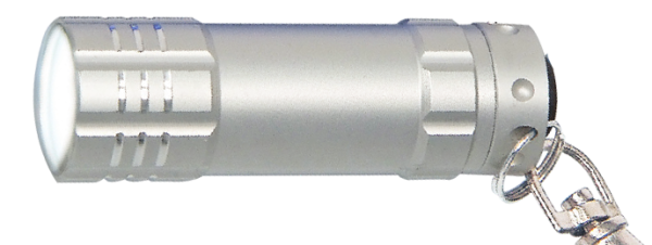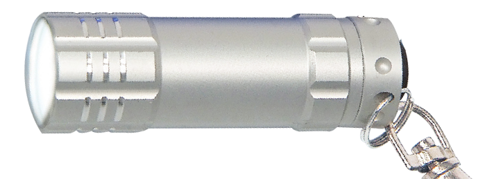 LED-Taschenlampe "PROX" aus Metall mit Karabinerhaken und silberfarbenen Zierstreifen. Ausgestattet mit 3 Stck. sehr hellen LED-Leuchten. (Format: 55 x 17 mm (ohne Karabinerhaken) - Aufgrund der Batterieverordnung müssen wir eine Entsorgungspauschale berechnen. -