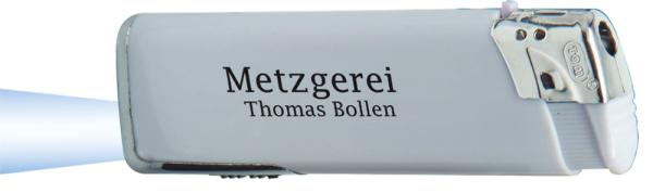 Elektronisches Multifunktionsfeuerzeug „NOSTRA“ mit LED-Taschenleuchte. Der Lichtschein ist bei allen Lampen weiß. Nachfüllbar mit Flammenregulierung. (Format: 80 x 24 mm) - Aufgrund der Batterieverordnung müssen wir eine Entsorgungspauschale berechnen. -