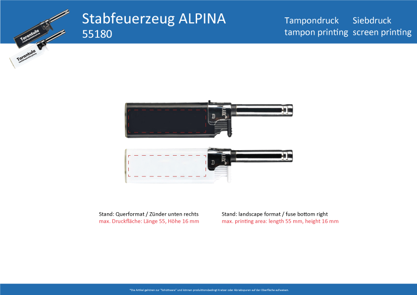 Stabfeuerzeug „ALPIN“ mit Verlängerungsrohr, nachfüllbar mit Flammenregulierung. (Format: 120 x 25 mm)
