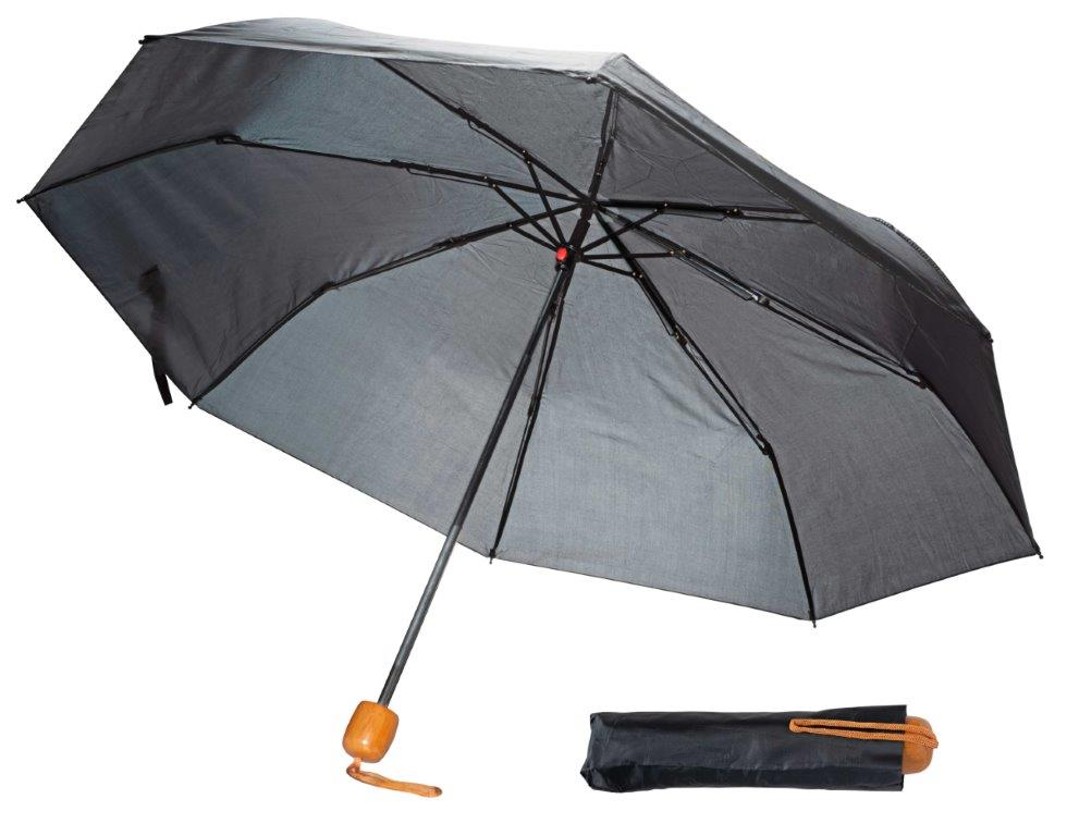 Taschenschirm „MINI“ - Lassen Sie Ihre Kunden nicht im Regen stehen! Praktische Handhabung mit großer Werbefläche. 100% Polyester. Gestell aus Fiberglas, Griff ist holz farbig. In Schwarz oder farblich sortiert lieferbar. (Format: 98 cm, Länge: 24 cm VE 72)