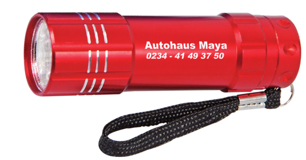 LED-Taschenlampe "BAMPY" aus Aluminium bestückt mit 9 starken LED-Lampen, die für besonders hohe Leuchtkraft sorgen. Inkl. 3 Batterien. Lieferung erfolgt in Geschenkbox. (Format: 85 x 22 mm) - Aufgrund der Batterieverordnung müssen wir eine Entsorgungspauschale berechnen. -