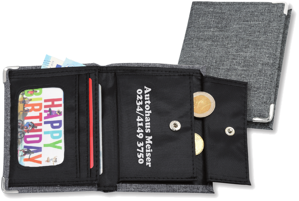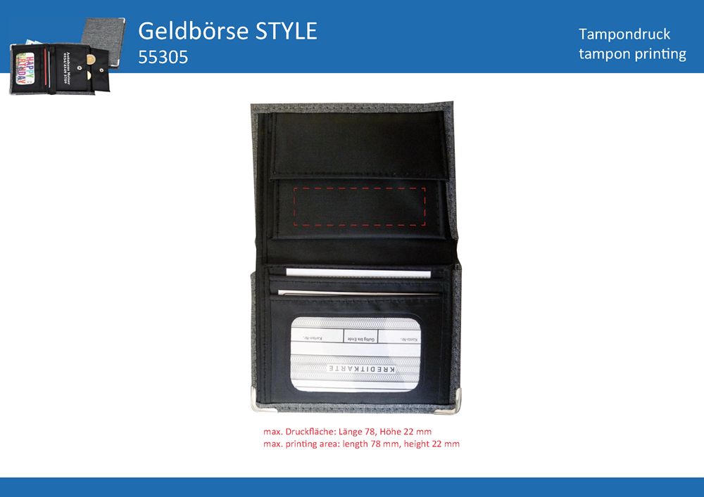 Geldbörse und Ausweistasche „STYLE“ im modernen SNOWFLAKE-LOOK mit vielen Innenfächern Werbeanbringung nur auf dem Innenteil möglich! 2 Einsteckfächer für Kreditkarten 3 Einsteckfächer für den KFZ-Schein und Personalausweis. 2 Stck. Silberecken (Format 125 x 95 mm)