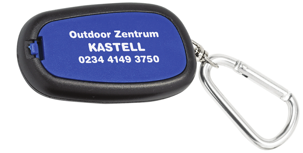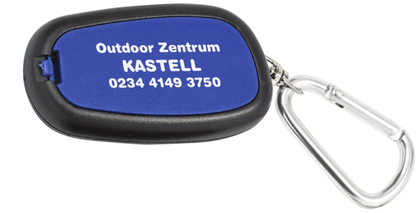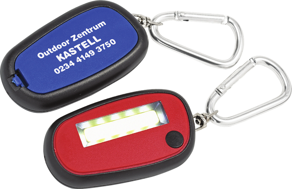 Schlüsselanhänger "FLASH" mit Taschenlampe/Taschenleuchte und Karabiner. Drei verschiedene Leuchtstufen die individuell geschaltet werden können. Durchgehend hell, gedimmt oder blinkend. (Format: 58 x 32 x 12 mm) - Aufgrund der Batterieverordnung müssen wir eine Entsorgungspauschale berechnen. -