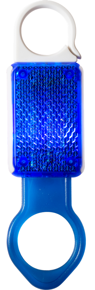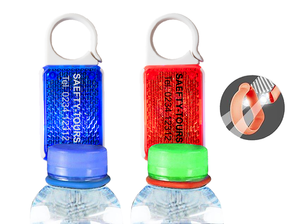Reflektierender Flaschenhalter "REFLEKTI" mit LED-Leuchte und Karabinerhaken. Inkl. Batterie. (Format: 124 x 33 mm) - Aufgrund der Batterieverordnung müssen wir eine Entsorgungspauschale berechnen. -