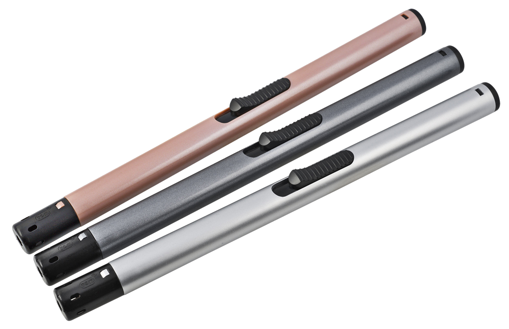 Stabfeuerzeug "ROCKET" aus Aluminium in einer weißen Umverpackung. Zum bequemen Anzünden von Kerzen , Pfeifen , Kamin oder Grill, Nachfüllbar, mit elektronischer Zündung. (Format: 225 x 14 mm, VE 40/240)