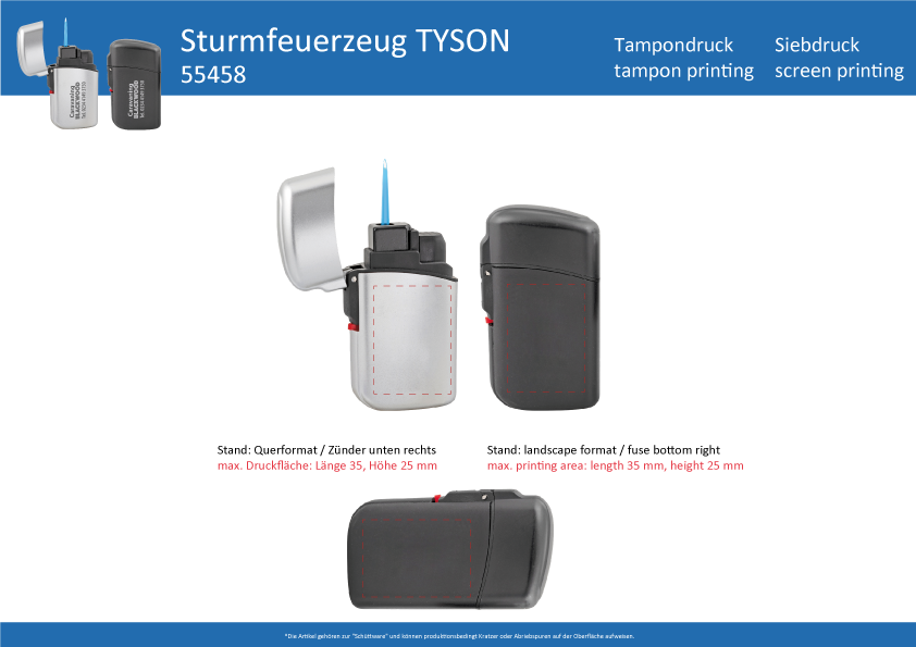Sturmfeuerzeug „TYSON“ Wind- und wetterfestes Feuerzeug mit Klappverschluss, nachfüllbar und mit großer Werbefläche. (Format: 65 x 35 mm)